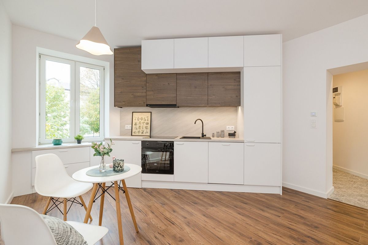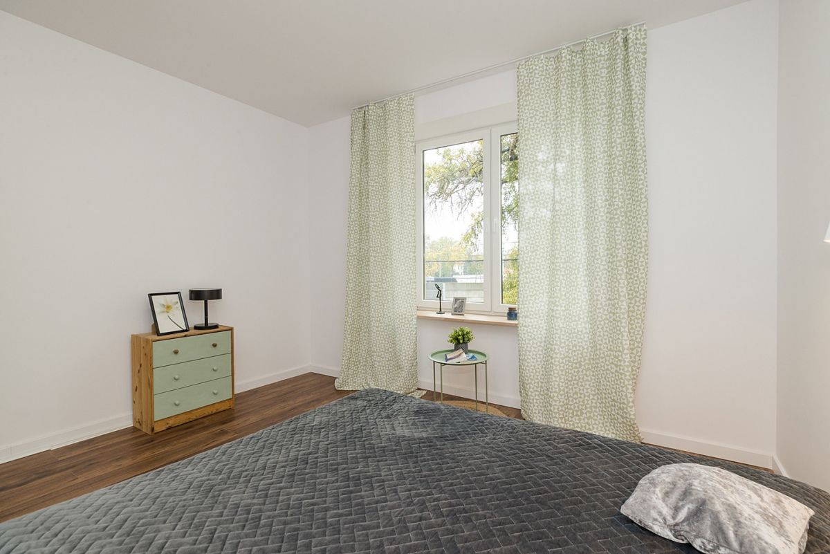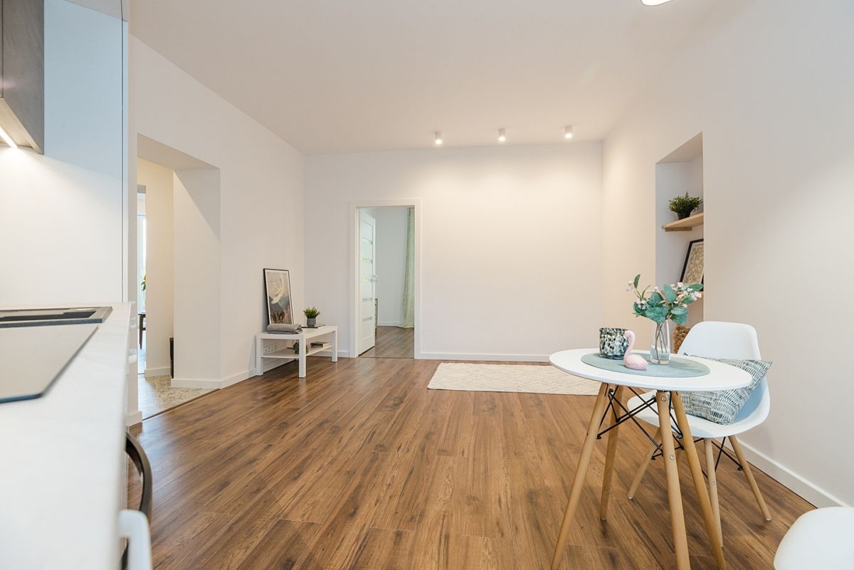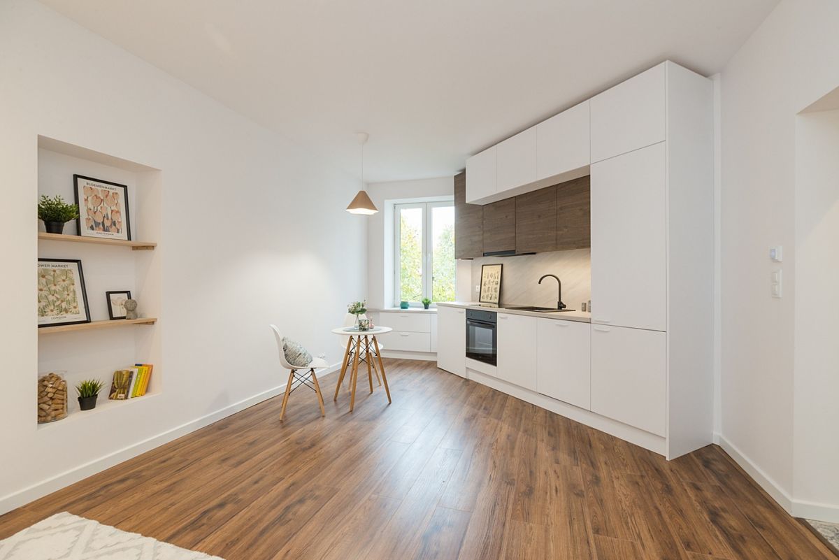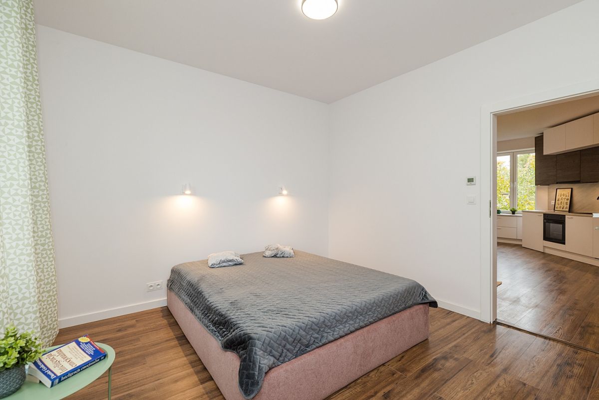 lub jako salon, oddzielną dużą, widną kuchnię i sypialnię, co spodoba się miłośnikom klasycznego układu wnętrz.